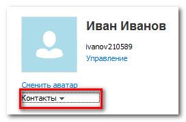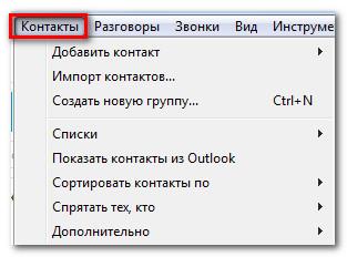 Меню Контакти містить велику кількість пунктів з управління контактами. Є, наприклад, корисні команди імпорту контактів і порядку сортування контактів у вікні Skype.