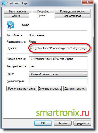 - У кінцевому підсумку, у Вас повинне вийти наступне: «C:Program FilesSkypePhoneSkype.exe» /legacylogin — (включаючи лапки). Чи наступне, якщо у Вас 64-х бітна система: «C:Program Files (x86)SkypePhoneSkype.exe» /legacylogin