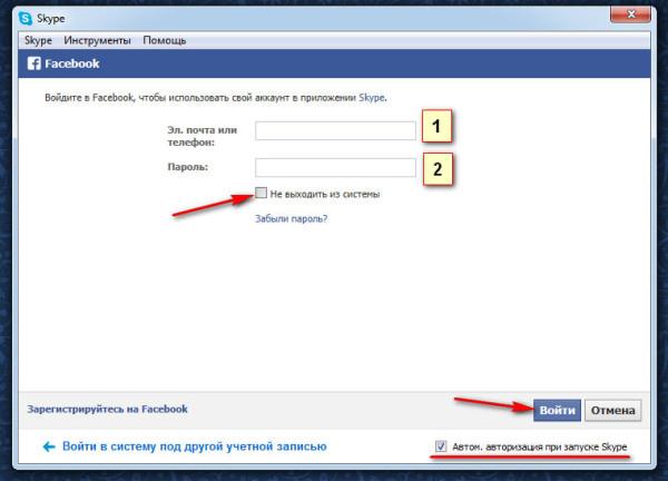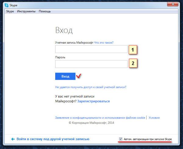 Отже, для першого способу натискаємо кнопку «Логін Skype» і переходимо до вікна введення логіна і пароля облікового запису Skype. В полі під номером 1 вводимо свій унікальні логін, який ви собі попередньо завели, в полі під номером 2 вводимо свій унікальний пароль від облікового запису Skype, який ви собі придумали. Якщо ви хочете, щоб програма автоматично вас авторизировала при запуску, поставте галочку в правому нижньому кутку — «Автом. авторизація при запуску Skype». І в кінці натискаємо кнопку «Увійти». Якщо на комп’ютері, де встановлений скайп, цією програмою користуються кілька власників, то після всіх входів, можна буде вибирати з випадаючого списку той логін, під яким ви хочете зайти.