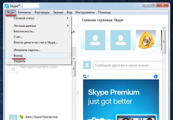 У разі правильно введені логіна і пароля, Скайп запуститься і ви побачите початковий екран програми. Щоб вийти з програми Skype, натисніть кнопку в лівому верхньому кутку меню Skype і у випадаючому списку виберіть «Вихід».