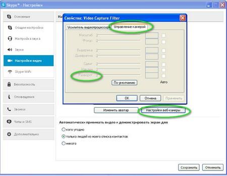 Зайдіть в Skype меню «Інструменти». Потім перейдіть в «Налаштування», виберіть пункт «Налаштування відео» і натисніть кнопку «Налаштування Веб-камери».