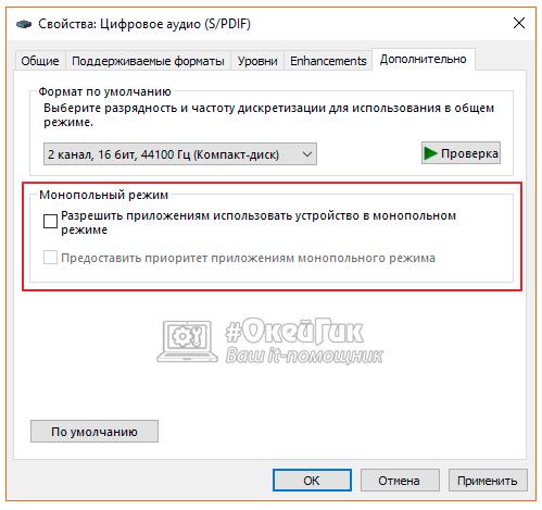 Деякі версії Windows 10 можуть конфліктувати з драйверами звукової плати, з-за чого у вас будуть виникати дефекти при прослуховуванні звуку в монопольному режимі. Також проблеми з монопольним режимом звучання можуть виникати на слабкому комп’ютері. Щоб виключити варіант виникнення тріска, шипіння і хрипа при відтворенні звуку з-за монопольного режиму, рекомендуємо спробувати його відключити.