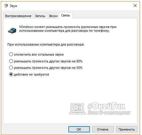 Тихий звук Windows 10 через параметрів зв’язку