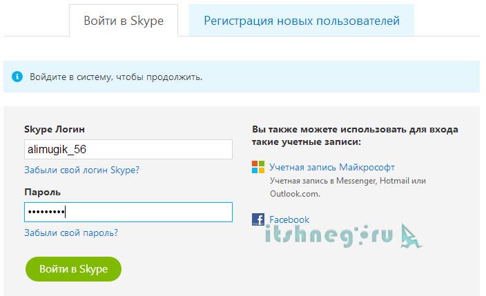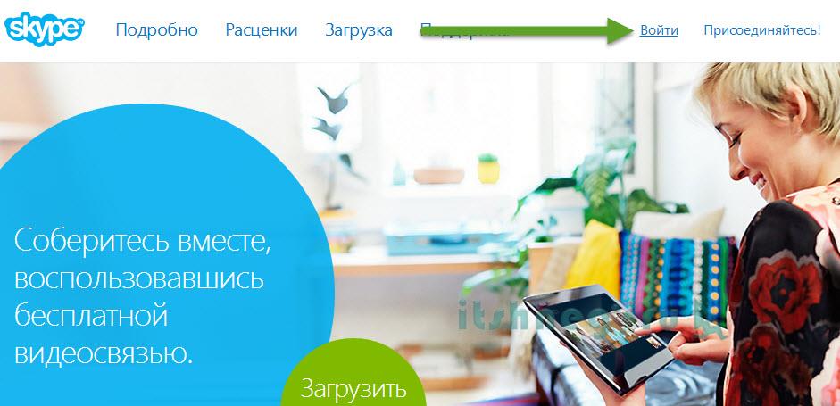 Топаємо на офіційний сайт www.skype.com/ru/ і виконуємо вхід в обліковий запис за чинним логіном і паролем.