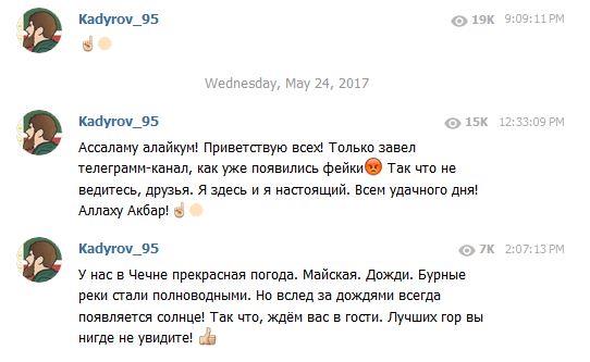 Менш ніж за добу на канал підписалося 4,5 тисячі осіб. В описі каналу говориться «Любіть Пророка, читайте салават!». Першим повідомленням Кадирова став эмоджи, потім він поскаржився на фейків і запросив своїх передплатників в республіку.