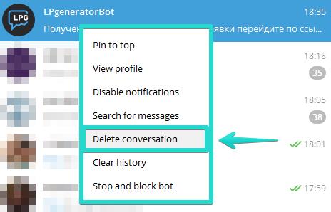 Якщо перейти в Особистий кабінет з якихось причин не виходить, ви можете видалити бота через Telegram. Для цього натисніть на бота правою кнопкою миші і виберіть наступні пункти: