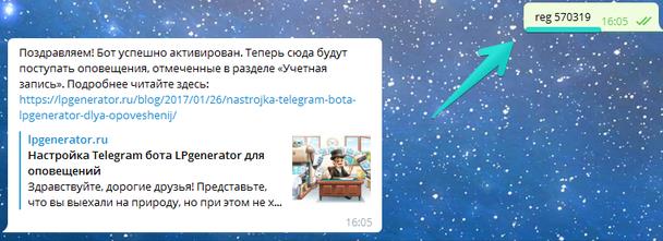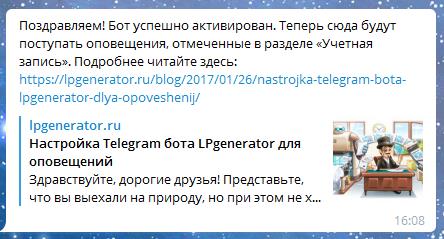 Воно означає, що бот успішно інтегрований з вашим акаунтом LPgenerator і тепер буде надсилати сповіщення.
