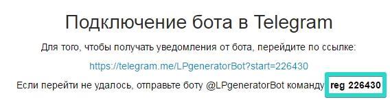 У цьому випадку поверніться в Особистий кабінет LPgenerator, поновіть сторінку і спробуйте додати Telegram повідомлення заново (в цьому випадку сгенерируется новий код, який ви зможете відправити боту).
