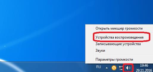 Після закінчення інсталяції Virtual Audio Cable, натискаємо правою кнопкою миші по значку динаміка в області сповіщень ПК. У контекстному меню вибираємо пункт «Пристрої відтворення».