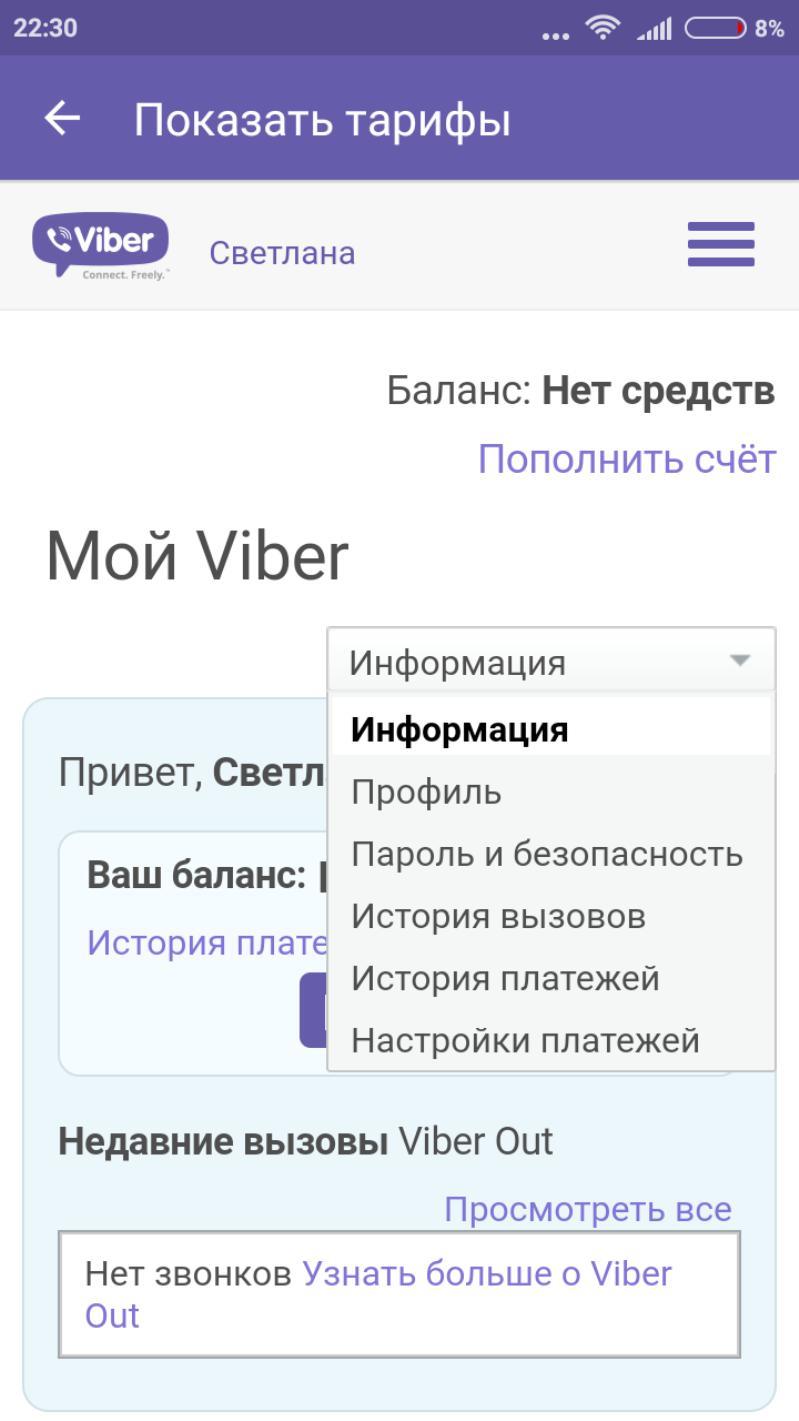 У додатку Вайбер Аут є меню «тарифи». Заходимо в нього і бачимо наступне: