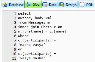 select author, body_xml Messages from m inner join Chats c on m.[chatname] = c.[name] where c.[participants] = ‘masha vasya’ or c.[participants] = ‘vasya masha’;