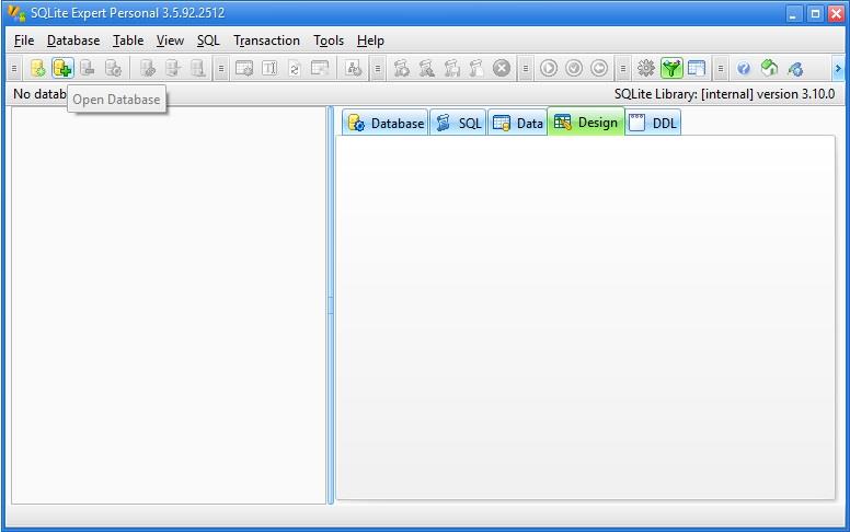 Будемо вважати, що програма у Вас вже встановлена і навіть відкрита. У вікні програми на панелі інструментів, розташованої у верхній частині вікна, натискаємо на кнопку з зеленим плюсиком. При наведенні мишею на цю кнопку повинна з’явитися підказка «Open Database», як на малюнку.