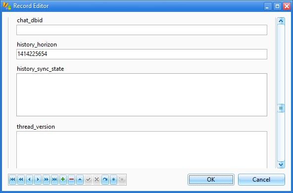 Поигралась з даними таблиці Conversations, обнуляти різні таймштампы, серед них таймштамп останньої активності (last_activity_timestamp), таймштамп скриньки вхідних повідомлень (inbox_timestamp), вже згадувані history_horizon і history_sync_state і ще деякі. Принаймні у мене, навіть коли я обнулила всі дані у конкретного партнера по скайпу, перезатягивания повідомлень не сталося після перезавантаження скайпа. Тим не менше, коли я копіювала різні версії main.даних з сервера підтягувалися відсутні для даної версії повідомлення. Можливо, скайп, орієнтується на щось.