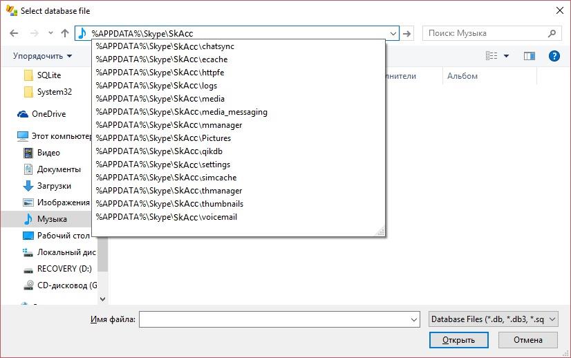 Після натискання на неї з’явиться стандартне віндове вікно відкриття файлу. Щоб знайти файл бази даних Skype, у вікні у верхнє поле вводу адреси вставити наступну адресу: %APPDATA%SkypeSkAcc, де замість SkAcc напишіть свій логін в скайпі, і натисніть Enter.