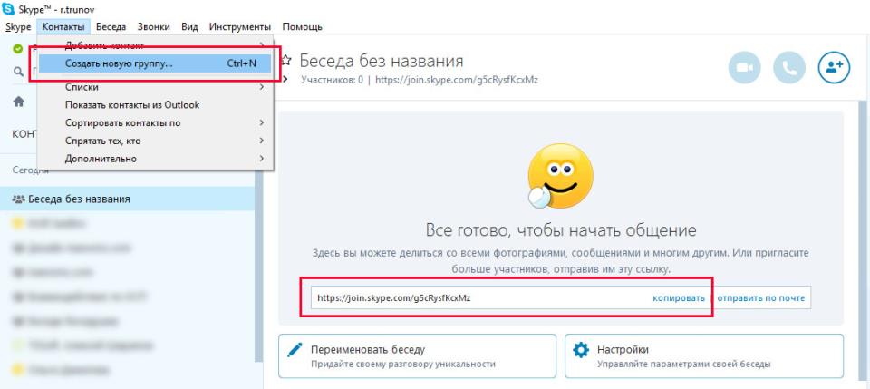 Також, якщо ви є адміністратором групи, то можете запросити в групову бесіду співрозмовників, які не зареєстровані в Skype. Для цього натисніть правою кнопкою миші на назві групи → «Переглянути особисті дані» → виберіть «Створити посилання, щоб всі бажаючі змогли приєднатися». Скопіюйте це посилання і відправте співрозмовнику.