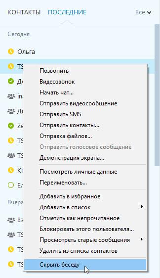 Якщо в списку останніх діалогів клікнути правою кнопкою миші на контакт, то останнім пунктом у контекстному меню буде «Приховати бесіду»: