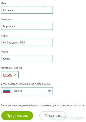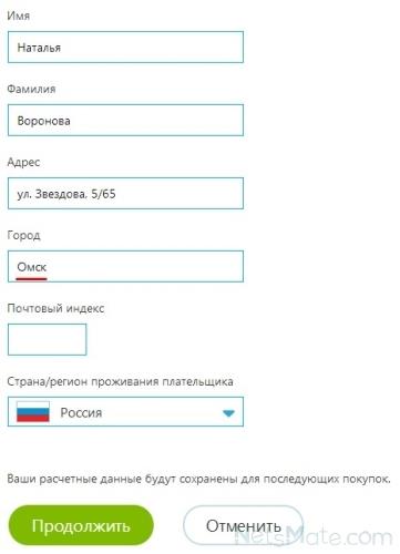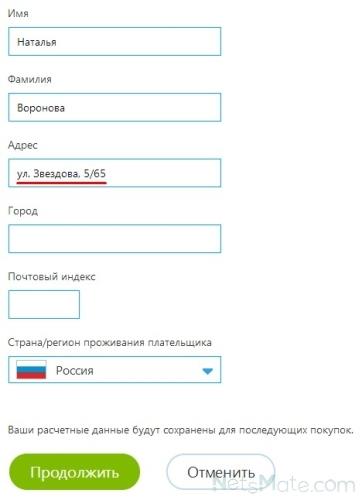 - З’являється спеціальна форма. Ім’я та прізвище вже введені. Кожен, хто задається питанням, як закинути грошей на скайп, повинен бути готовий до того, що потрібно написати адресу. Вводимо його в спеціальне вікно.