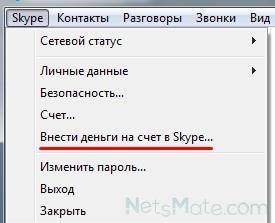 - У меню вибираємо «Внести гроші на рахунок в Skype».