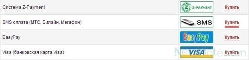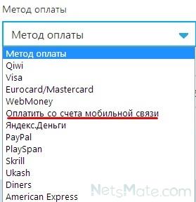 - Так як оплата скайп буде здійснюватися за допомогою телефону, в списку вибираємо «SMS оплата», натиснувши кнопку «Купити».