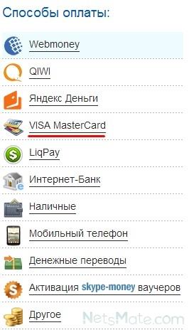 - Зліва перераховані способи оплати. Якщо ви цікавитеся, як покласти гроші на skype-рахунок, і при цьому у вас є банківська карта, вибирайте VISA MasterCard.
