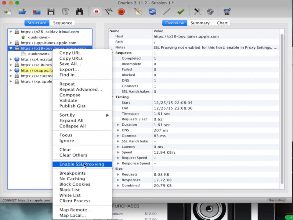 4. Вибрати рядок «buy.itunes.apple.com» і викликати контекстне меню правою кнопкою мишки, далі включити пункт «Enable SSL Proxying».