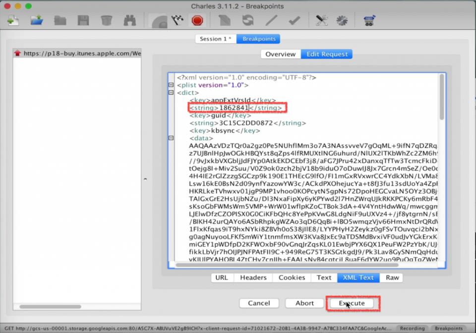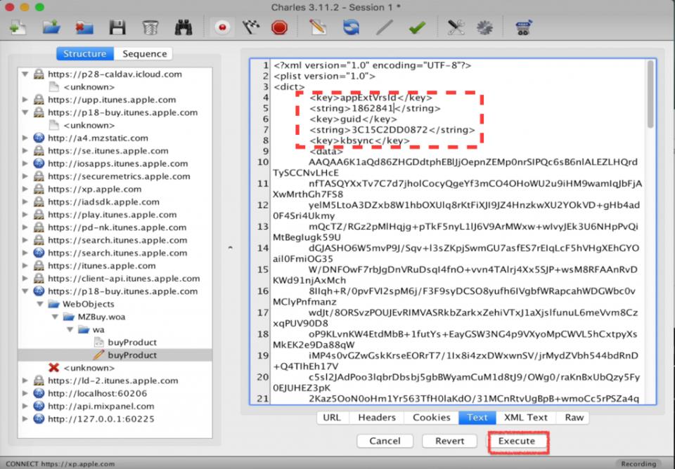 18. Повернуться в Charles, вибрати активність «buy.itunes.apple.com», а в правій частині вікна переключитися на Edit Request —> XML Text.