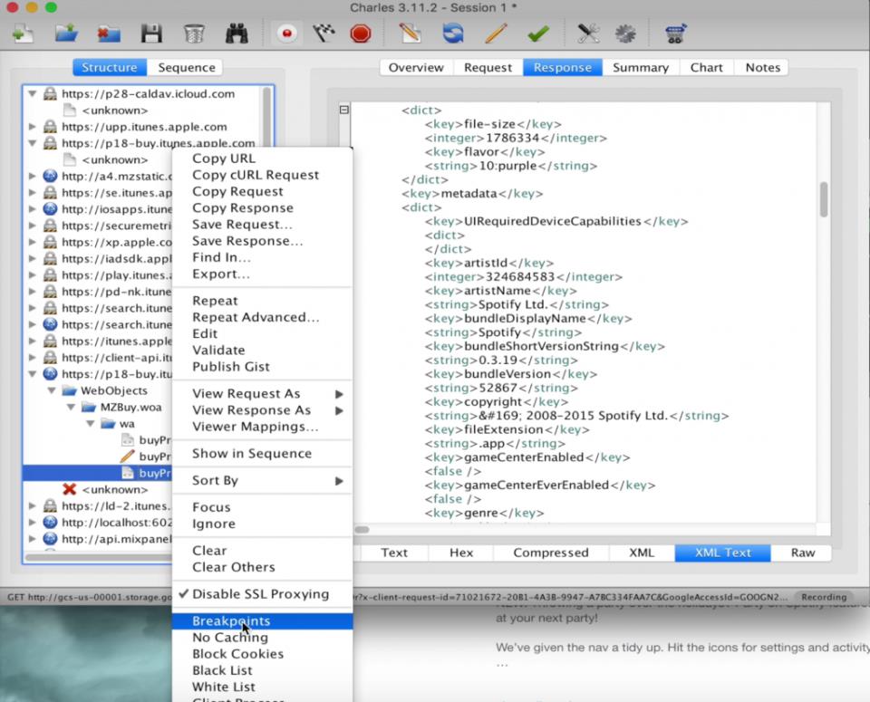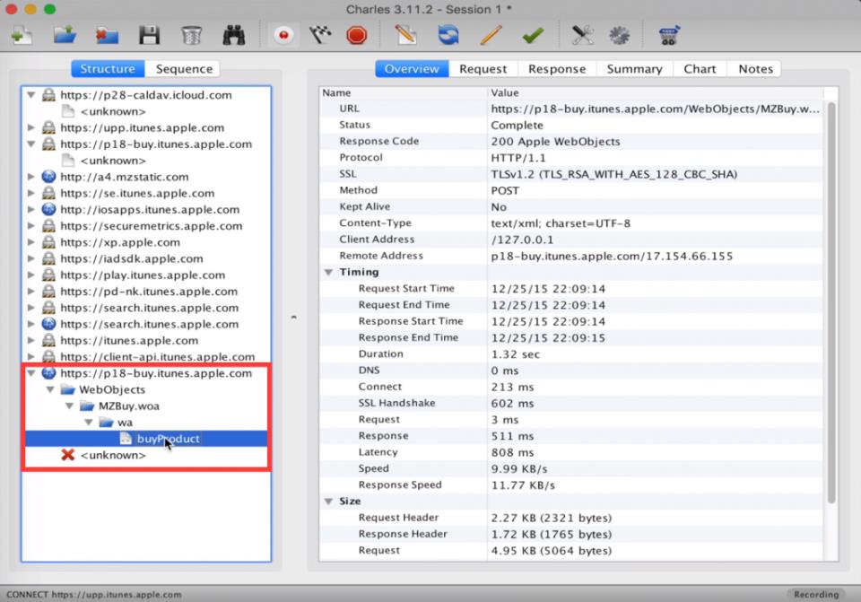 3. Розпочати завантаження програми в iTunes і в Charles в розділі Structure знайти активність виду «buy.itunes.apple.com».