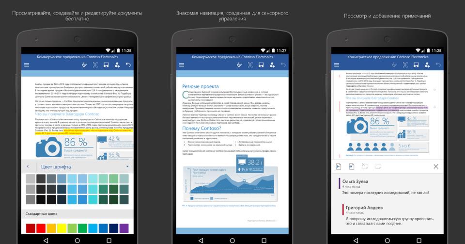 Після приблизно місяці відкритого тестування Microsoft виклала в Google Play повнофункціональні мобільні версії своїх офісних програм Word, Excel і PowerPoint для Android-смартфонів (планшетні були доступні вже кілька місяців). Базові функції текстового редактора, редактора таблиць і додатки для презентацій доступні безкоштовно. Додатки доступні для смартфонів з версією Android 4.4 (KitKat) і вище (за винятком поки не підтримуваного новітнього Android M). Крім того, обсяг оперативної пам’яті пристрою повинен бути не менше 1 ГБ.