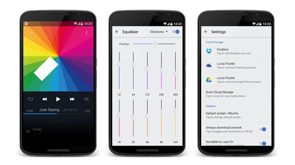 Так, плеєрів «з хмари» в Google Play море, але CloudPlayer, незважаючи на невинахідливе назва, мені якось відразу сподобався. По-перше, мінімалістичний інтерфейс в кращих традиціях «матеріального дизайну» Google в комплексі з простою та зрозумілою навігацією. По-друге, підтримка відразу трьох «хмар» — Dropbox, Google Drive і Microsoft OneDrive. По-третє, підтримка FLAC і ALAC. В-четверте — якісно реалізований еквалайзер.