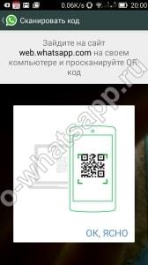 - У Меню на телефоні (в Вацапе) шукаємо WhatsApp Web і скануємо код. Після цього онлайн вхід в додаток Вацап здійснений.