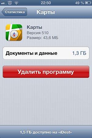 Деякі додатки, маючи невеликий розмір, накопичують інформацію, яка його багаторазово перевищує. Щоб дізнатися, наскільки більше важить ця інформація, ніж сама програма, потрібно зайти в Настройки -> Основні -> Статистика і вибрати що цікавить додаток в списку. Видаливши програму цим способом і шляхом відновлення її заново через магазин на пристрої iTunes на комп’ютері, ви зможете очистити її від накопичених даних. Слід врахувати, що при видаленні програми зітруться всі пов’язані з нею дані, будь то документи або збереження.