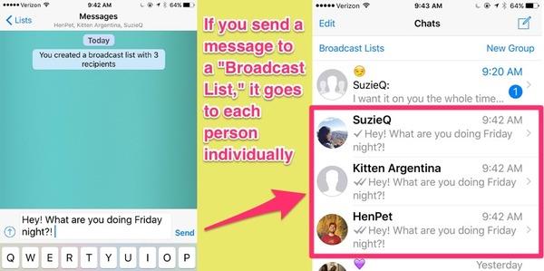 Ви можете відправити одне повідомлення групі людей, але при цьому кожен з них буде впевнений в тому, що це приватна бесіда. Щоб зробити це, натисніть на посилання Broadcast Lists в лівому верхньому кутку головного вікна програми. Виберіть, що вас цікавлять користувачів, введіть повідомлення та надішліть його. Кожен з користувачів отримає приватне повідомлення і подальшу розмову вестиме з вами в окремому чаті.