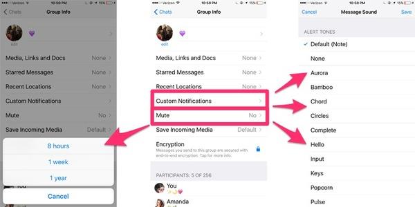 Управління звуковими повідомленнями груп буде дуже до речі, якщо ви не хочете відволікатися на чат, який тимчасово вас не цікавить. Функція Mute, що дозволяє відключити звук для групи на певний строк. Функція Custom Notifications дозволяє вибрати для групи унікальну мелодію оповіщення.