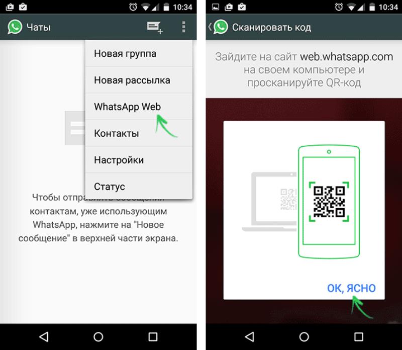 Потім потрібно буде запустити мобільну версію месенджера, натиснути на службову кнопку у вигляді трьох точок в правій верхній частині вікна WhatsApp і в контекстному меню натиснути на пункт «WhatsApp Web». Запуститься функція сканування QR-коду. Потрібно буде акуратно помістити квадрат з кодом виділену курсором на екрані телефону. Через деякий час код відсканує автоматично — і в браузері відкриється робоче вікно месенджера.
