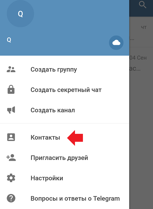 Крім того, ви можете додати новий контакт і через сам месенджер. Для цього запустіть Telegram, викличте меню і натисніть «Контакти».