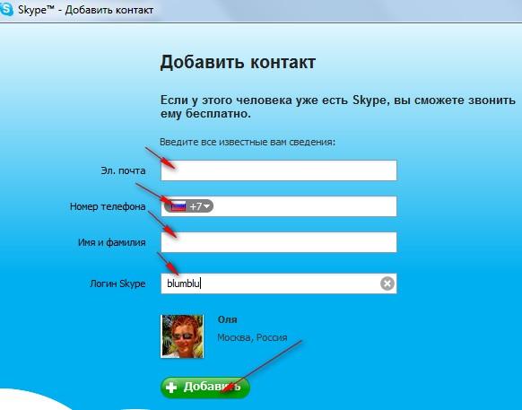 2. Відкриється нове вікно «Додати контакт», де необхідно набрати дані нового контакту: логін або електронну пошту, телефон, ім’я та прізвище. Коли висвітиться знайдений контакт, натисніть Додати:
