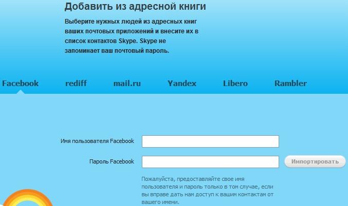 Використовуйте можливість імпортувати контакти в Skype з Facebook, з адресної пошти mail.ru, Yandex.ru та ін.