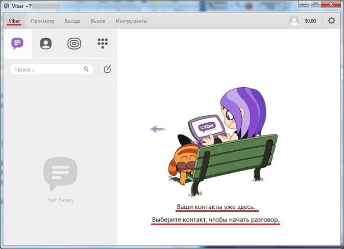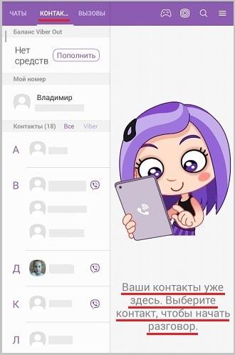 Відкриваємо додаток, клікнувши по кнопці «Відкрити» на черговій сторінці і спостерігаємо на вкладці «Контакти» повний список номерів, наявних в телефоні. Зверніть увагу — номери абонентів, у яких встановлено додаток Вибер, відзначені відповідним значком.