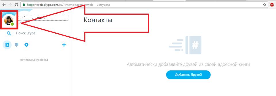 зачекайте, поки програма збере дані про ваших контактах. Це може зайняти декілька хвилин; після того, як у вікні вашого браузера відкрився Скайп, клацніть на фото свого профілю, як показано на малюнку;