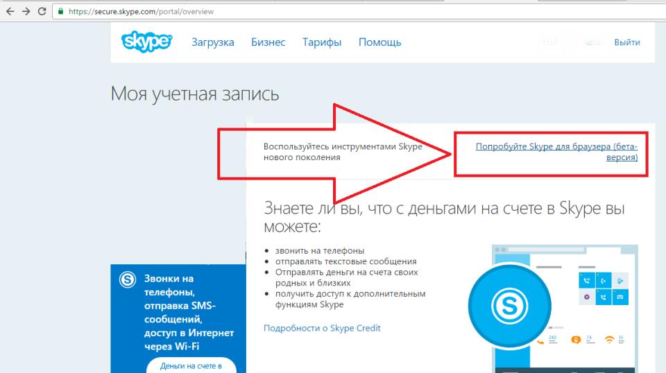 У вікні, знайдіть у правому верхньому куті ім’я свого профілю і натисніть на нього. Дочекайтеся завантаження нової веб-сторінки і перейдіть в бета-версії Skype для браузера;