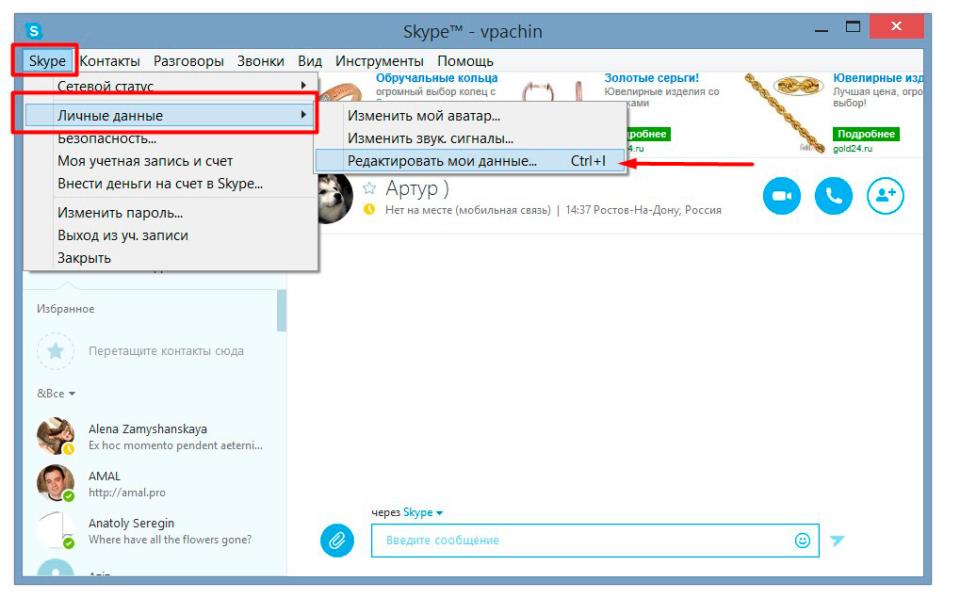 Всі ці способи побудовані просто на створення облікового запису з іншими даними. Їх можна з таким же успіхом просто відредагувати у вашому профілі. Потрібно зайти в програму, пройти всі етапи авторизації і в контекстному робочому вікні у верхньому куті, де є позначення Skype, вибрати «Особисті дані» і перейти до їх редагування. Вікно, що відкрилося, і потрібно обробити у відповідності з бажанням. Всі наявні важливі первинні дані, навіть зазначений власний сайт, видаляються.