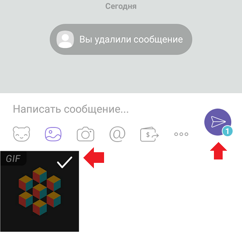 Далі ви побачите зображення в галереї. Анімовані зображення мають напис GIF. Натисніть на зображення, щоб на ньому з’явилася галочка, після чого натисніть на кнопку «Відправити» (можете також додати повідомлення). Таким чином можна прикріплювати відразу кілька гифок в одному повідомленні.
