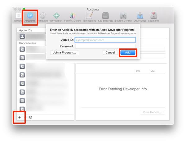 Крок 6: В Xcode з верхньої панелі виберіть Xcode > Preferences. У вікні, виберіть вкладку Accounts, натисніть кнопку «+» і виберіть опцію Add Apple ID. Тепер вкажіть ваш обліковий запис і пароль.