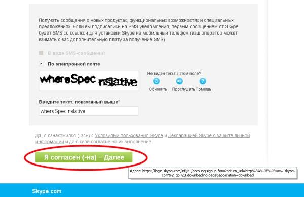 Після ознайомлення з умовами користування Скайп і декларацією Skype про захист особистої інформації, слід підтвердити свою згоду.
