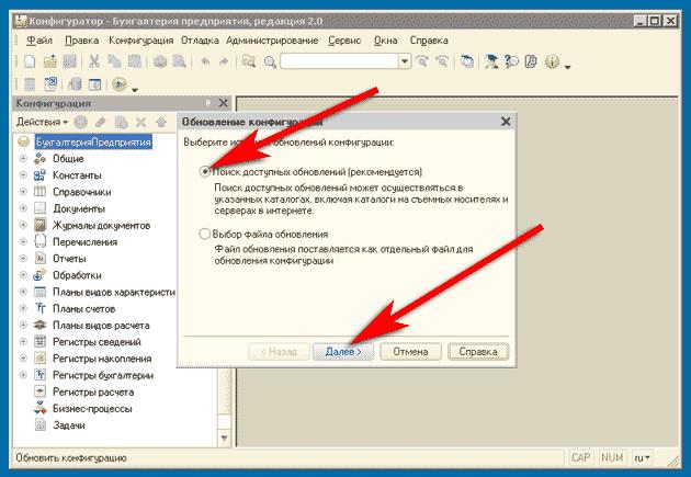 У діалозі оновлення конфігурації виберіть пункт «Пошук доступних оновлень» та натисніть кнопку «Далі».
