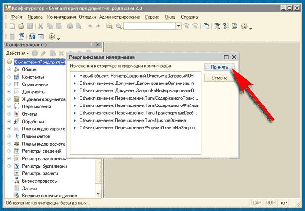 На наступному кроці потрібно погодитися з пропонованими змінами у структурі інформації. Натисніть кнопку «Прийняти». Почався процес оновлення бази даних може зайняти кілька хвилин. По закінченні процедури оновлення закрийте конфігуратор.