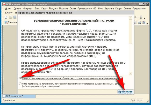 Після оновлення необхідно відкрити вашу базу в звичайному режимі (режим 1С:Підприємство) від імені користувача 1С з повними правами. Вам буде запропоновано прочитати умови розповсюдження оновлень програм 1С:Підприємство. Для початку роботи виберіть пункт «Я підтверджую легальність отримання оновлення у відповідності з викладеними вище умовами» і натисніть кнопку «Продовжити».