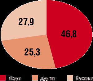 На рис. 2 представлено переваги респондентів щодо різних засобів VoIP. Лідируюча позиція Skype (46,8%) анітрохи не дивує. Це перша і, мабуть, найбільш зручна програма для передачі голосу через Інтернет. Всі інші конкуренти в сумі ледь набрали чверть всіх голосів (25,3%). Правда, у більш ніж чверті (27,9%) опитаних фахівців VoIP-кошти в интрасетях взагалі не використовуються. Ймовірно, в цьому винні загрози, які таїть застосування Skype.
