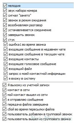 За допомогою вбудованого меню програми можна міняти мелодії для Скайпа, що супроводжують наступні події (самий перший пункт ставиться за замовчуванням до дзвінка):