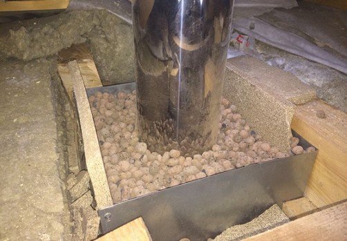 - Здійснюється утеплення проходу димоходу через стелю. Оптимальним є виготовлення теплоізоляції потолочно прохідного вузла з минерита.